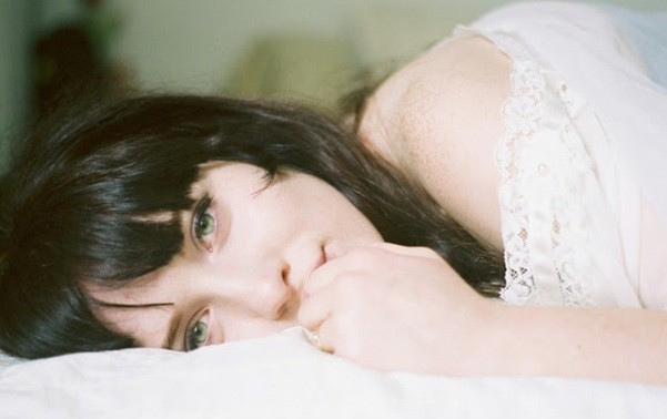 Beautiful sad girl laying image.