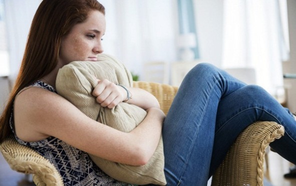 Sad girl sitting alone.